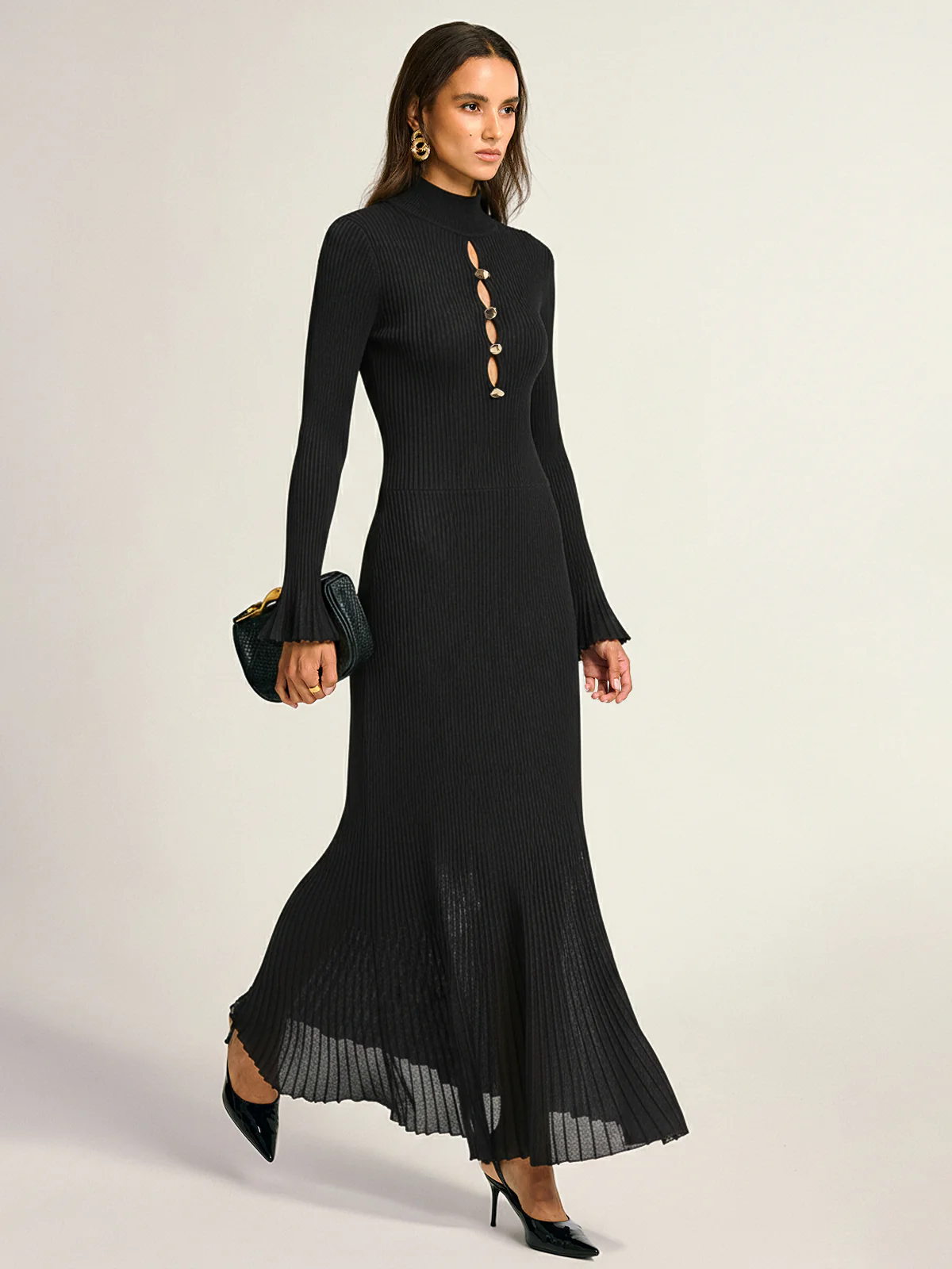 Metal Detail Mock Neck Long Sleeve Maxi Dress
