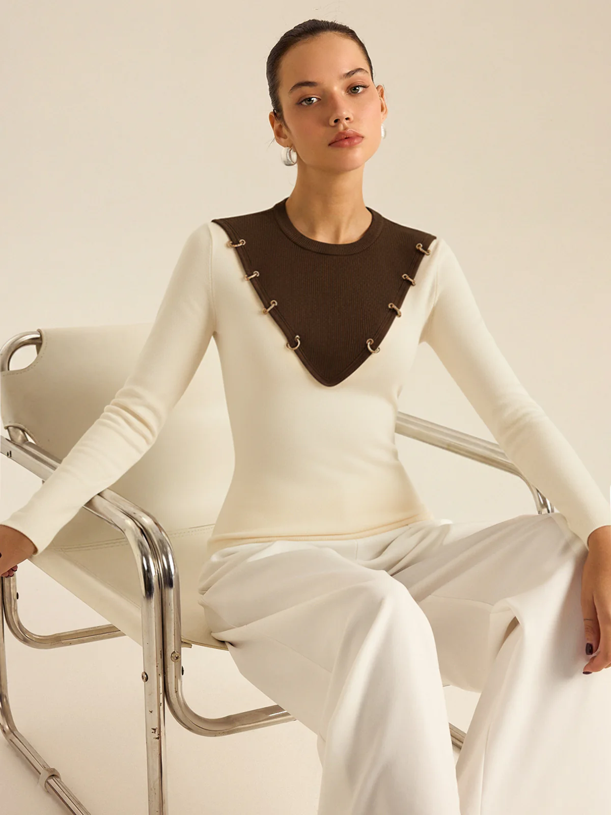Metal Detail Color-Block Long Sleeve Knit Top