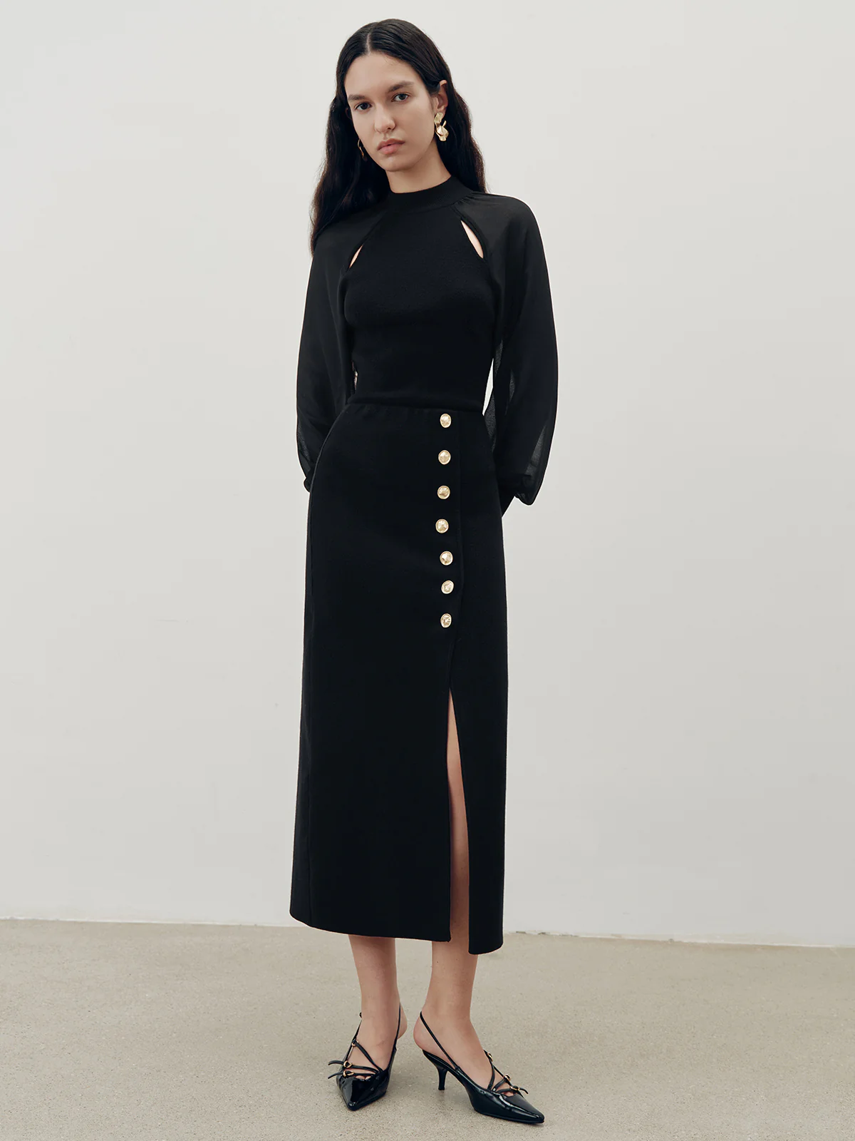 Metal Button Slit Maxi Skirt