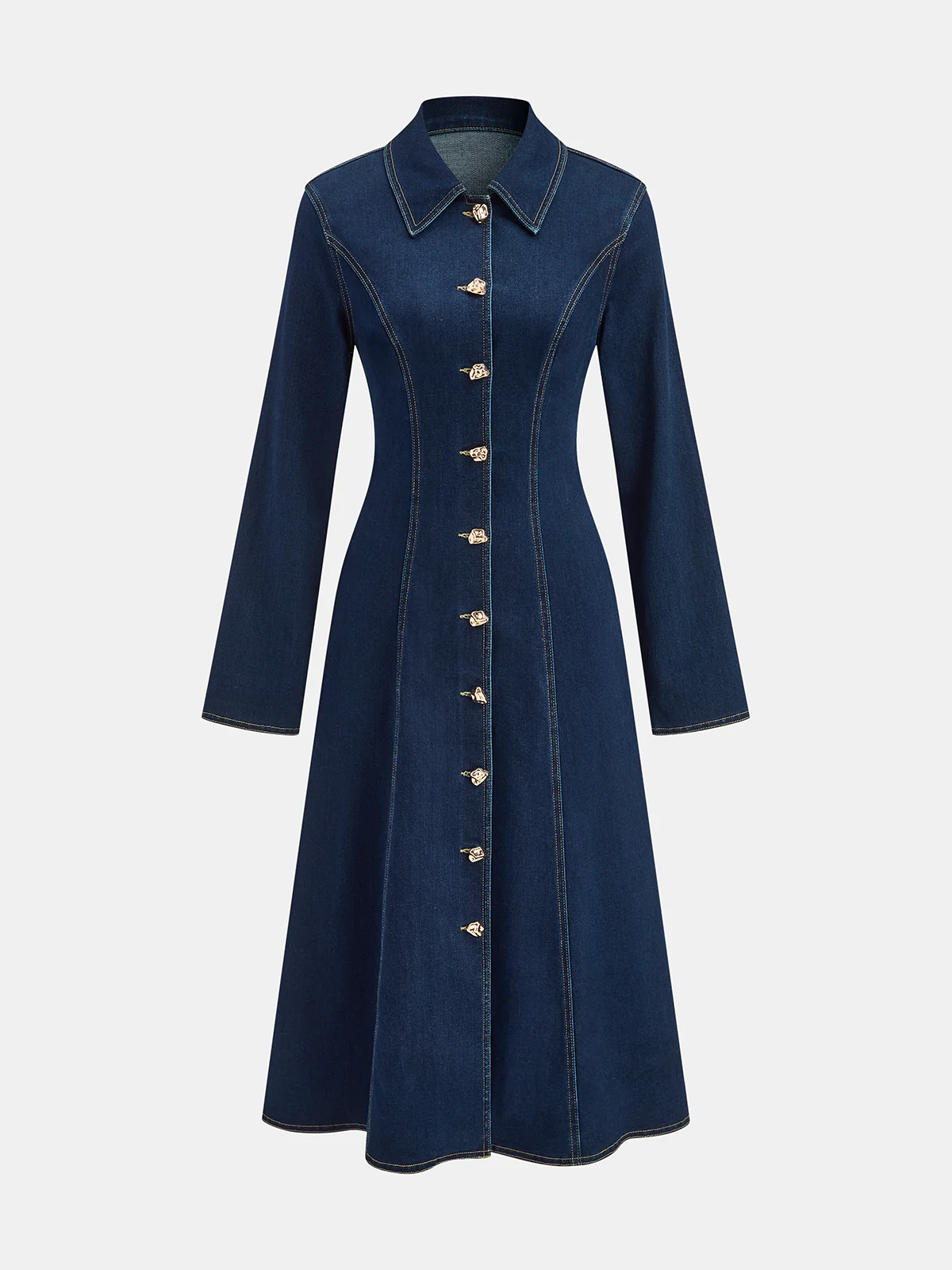 Metal Button Collared Denim Flare Dress