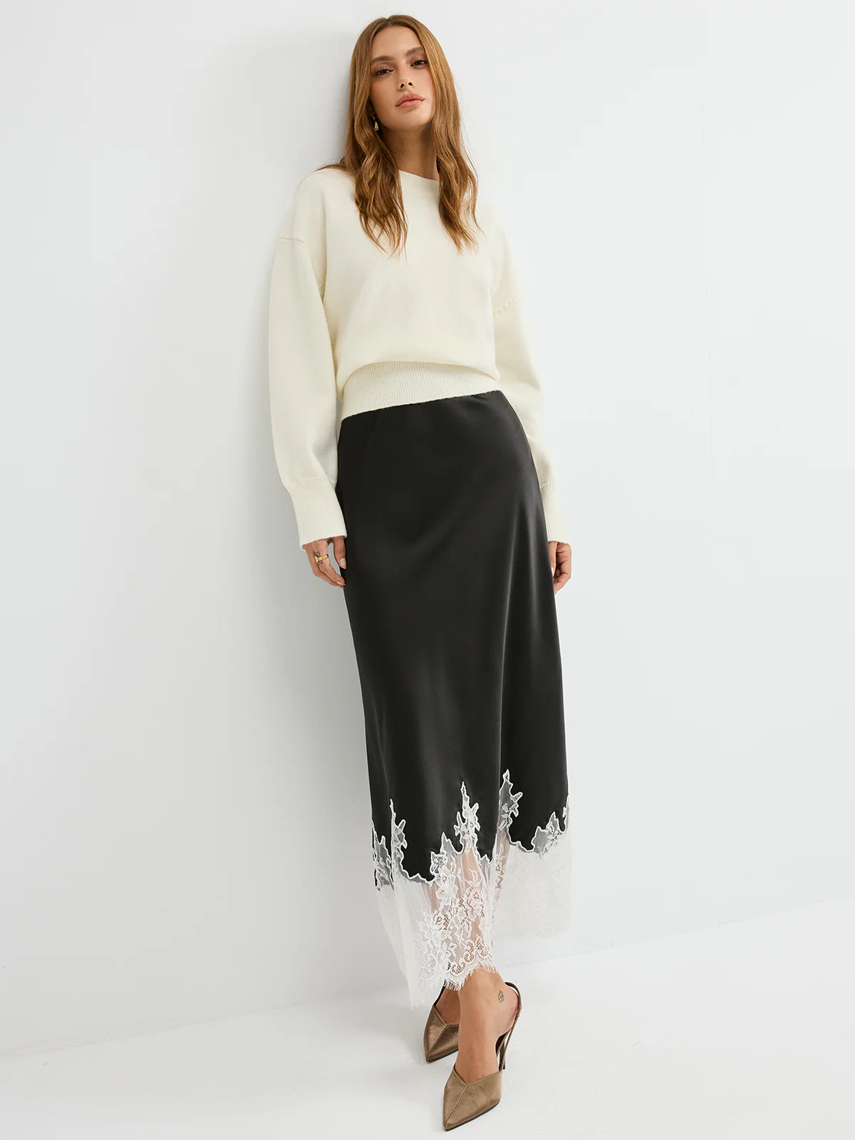 Lace Hem Satin Midi Skirt