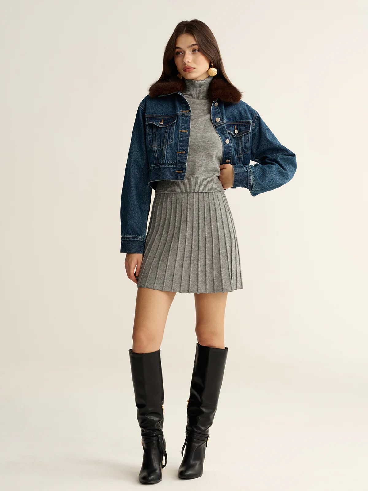 Faux Fur Collar Knit Panel Suede Effect Jacket