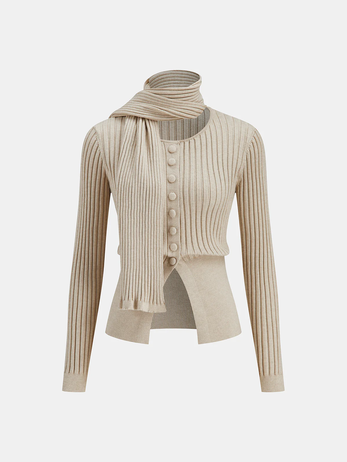 Button-Front Crew Neck Ribbed Knit Cardigan