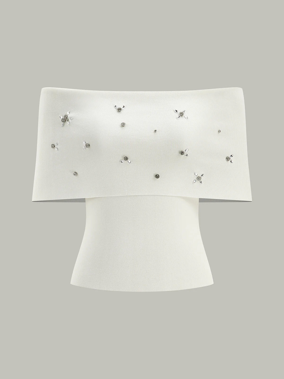 Semi-Sheer Halter Neck Ruched Top with Metal Floral Decor