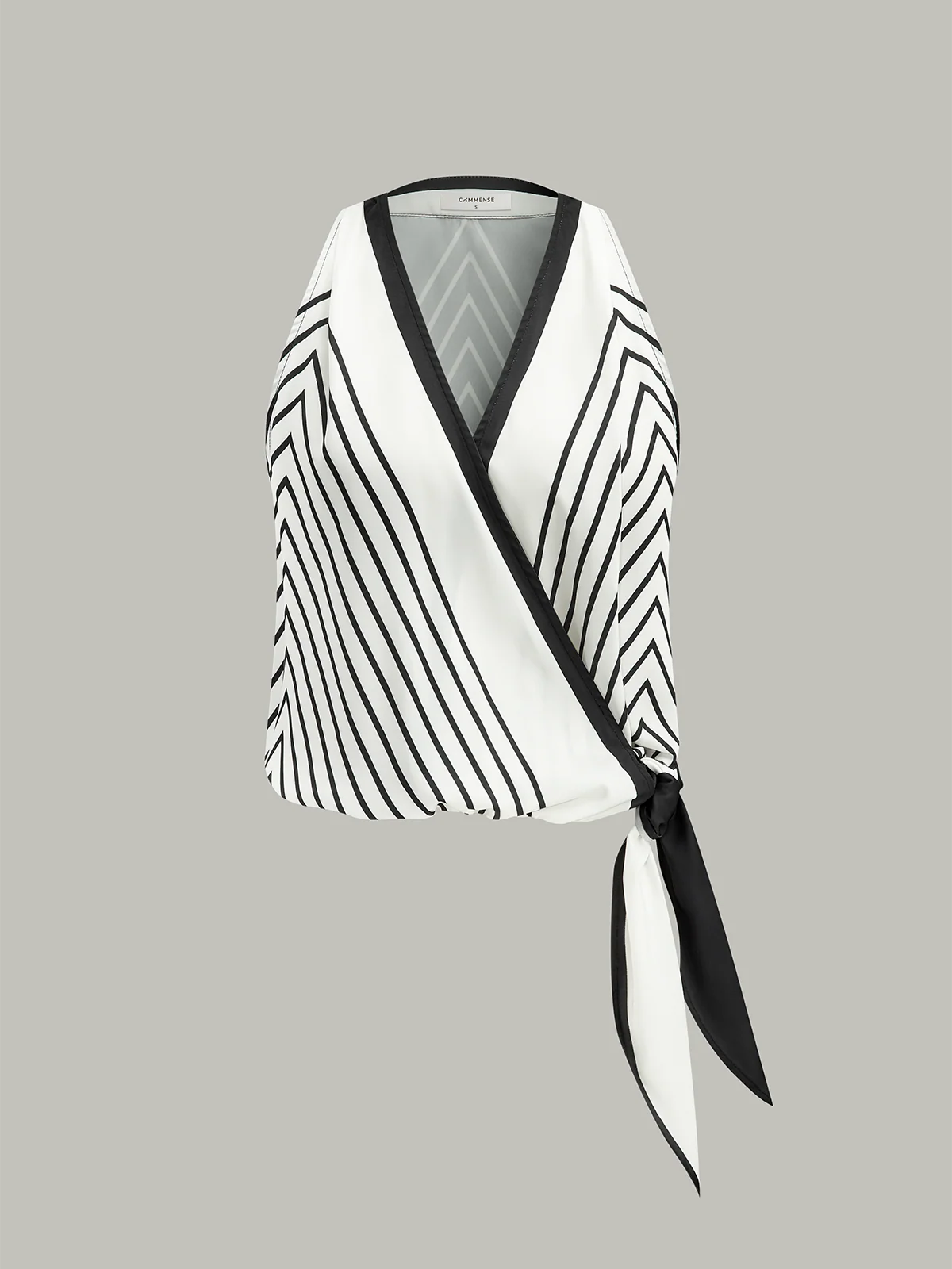 Semi-Sheer Striped Wrap-Front Knotted Top