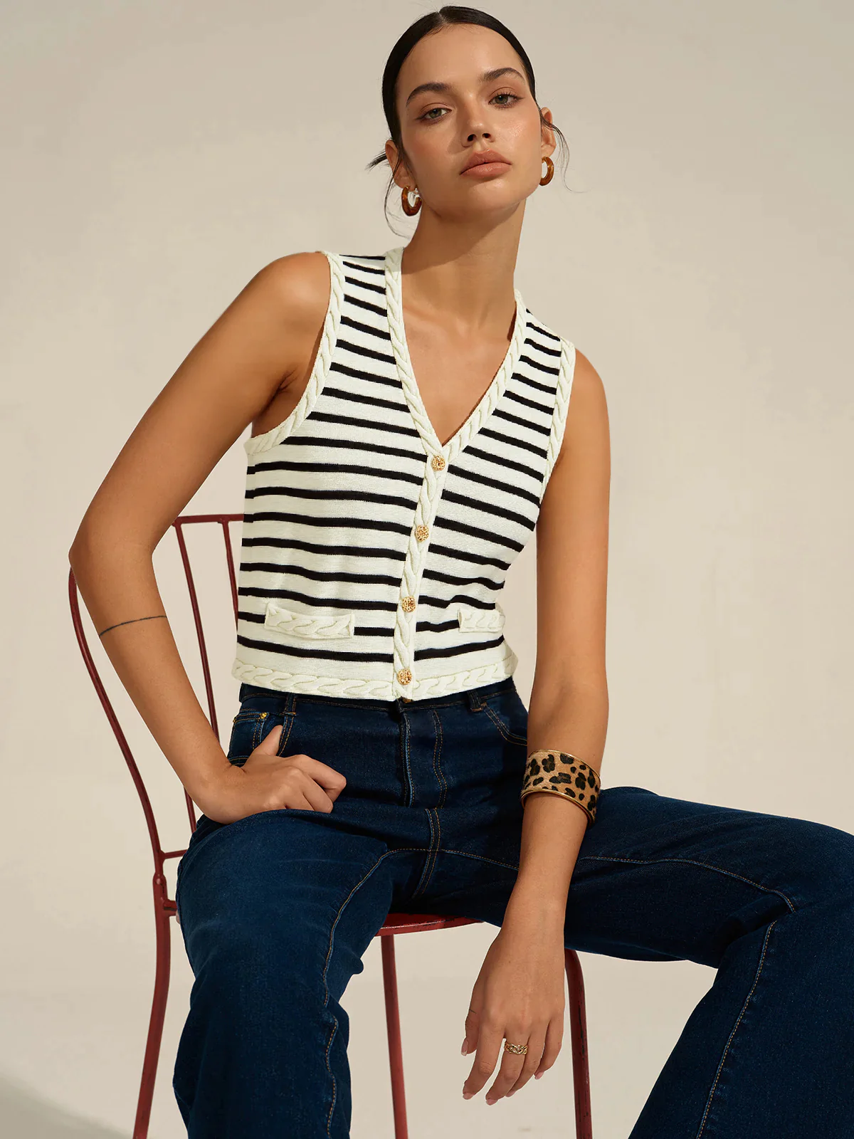 Cable Knit Trim Striped Vest