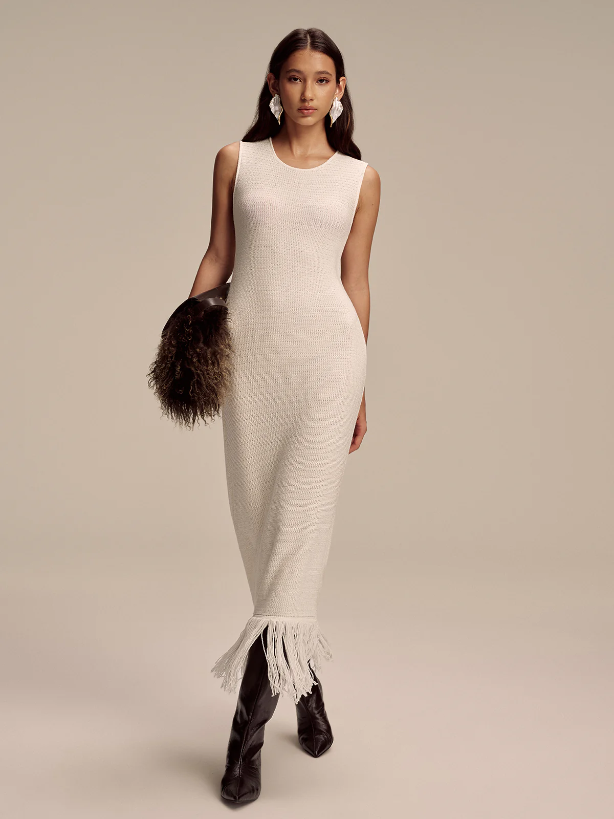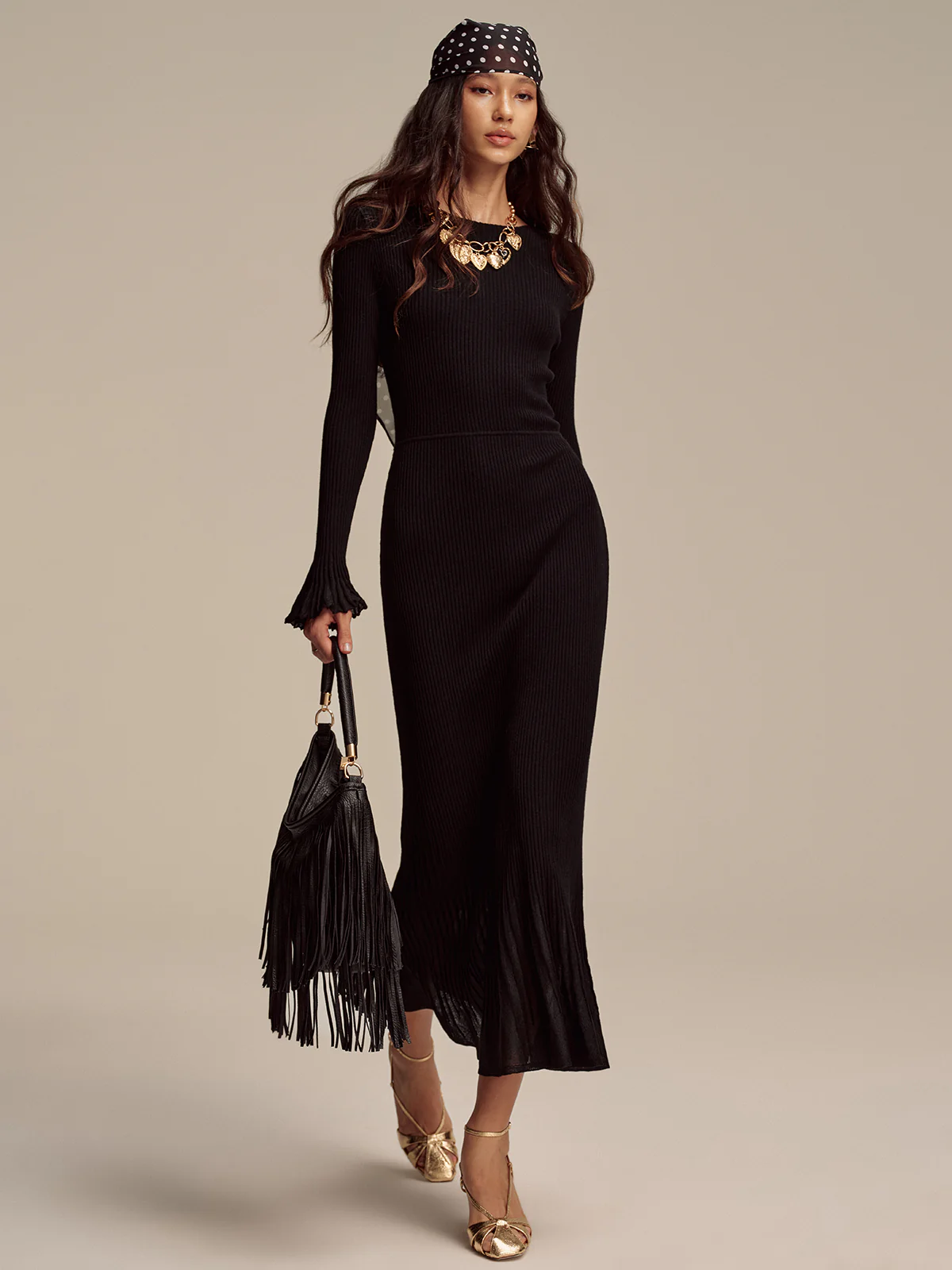 Wool Blend Ribbed Knit Maxi Dress with Mesh Hem