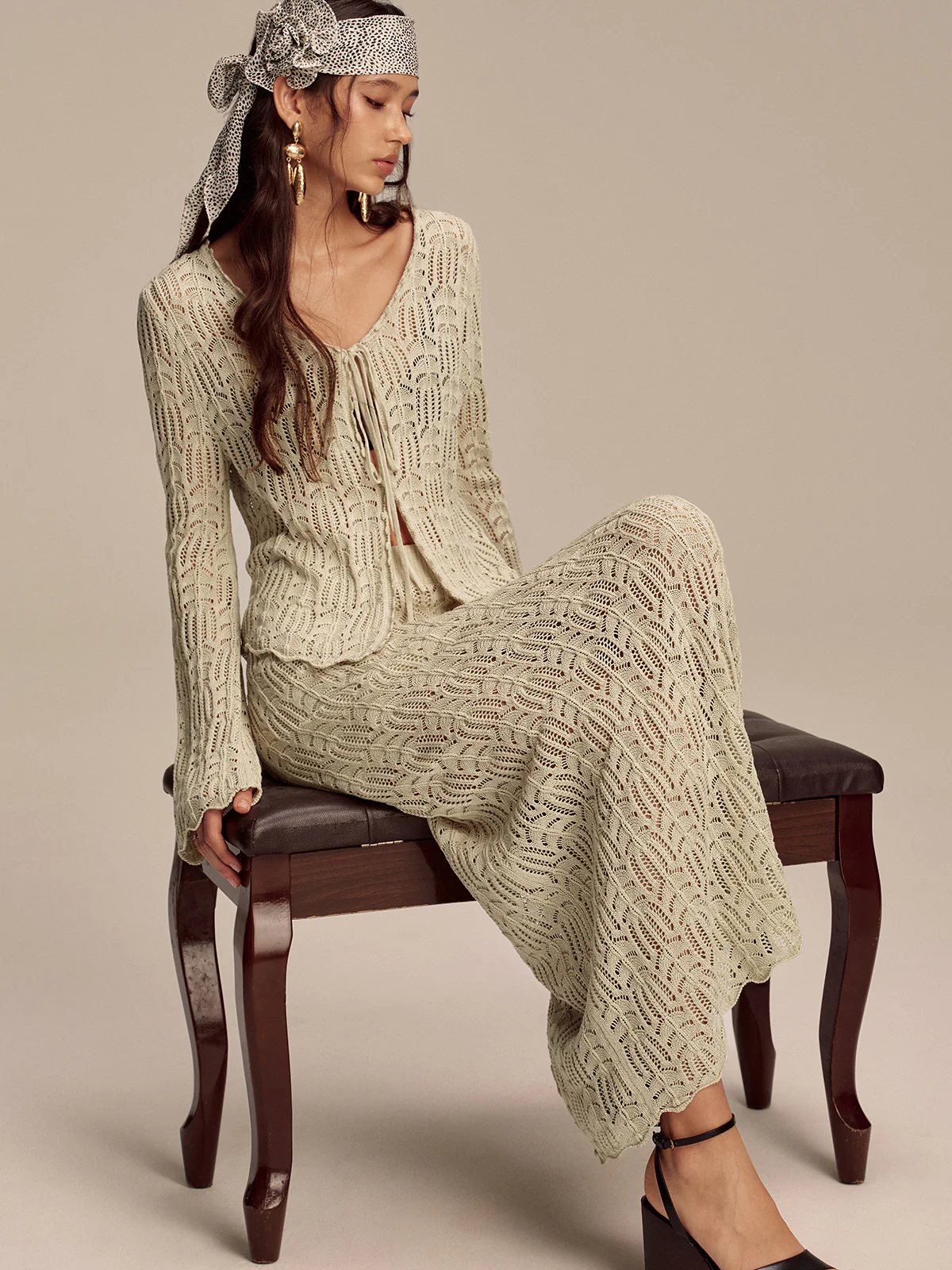 Ribbed Knit Mesh Ruffled Hem Bell Sleeve Top