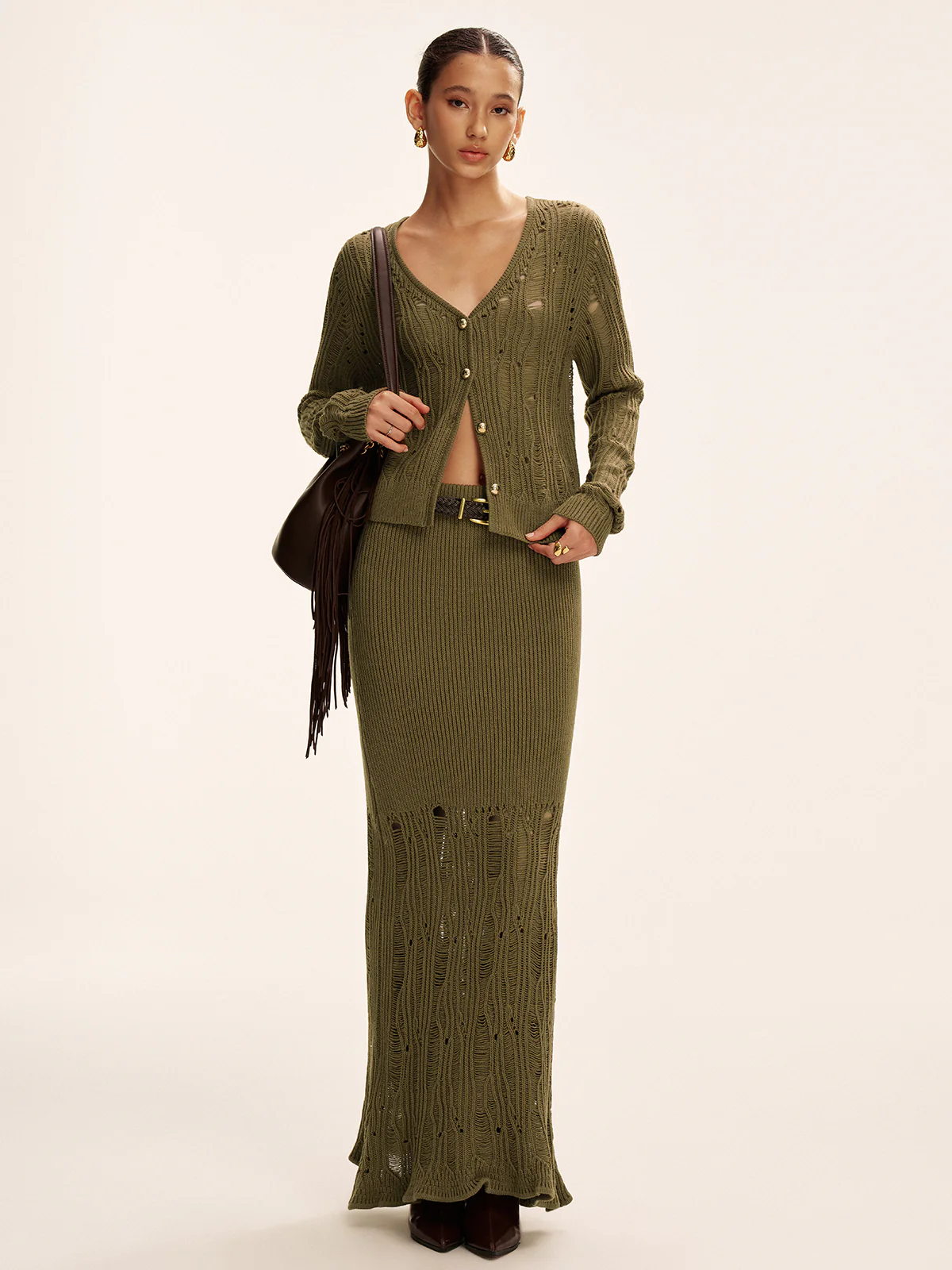 Metal Button Openwork Knit Skirt Set