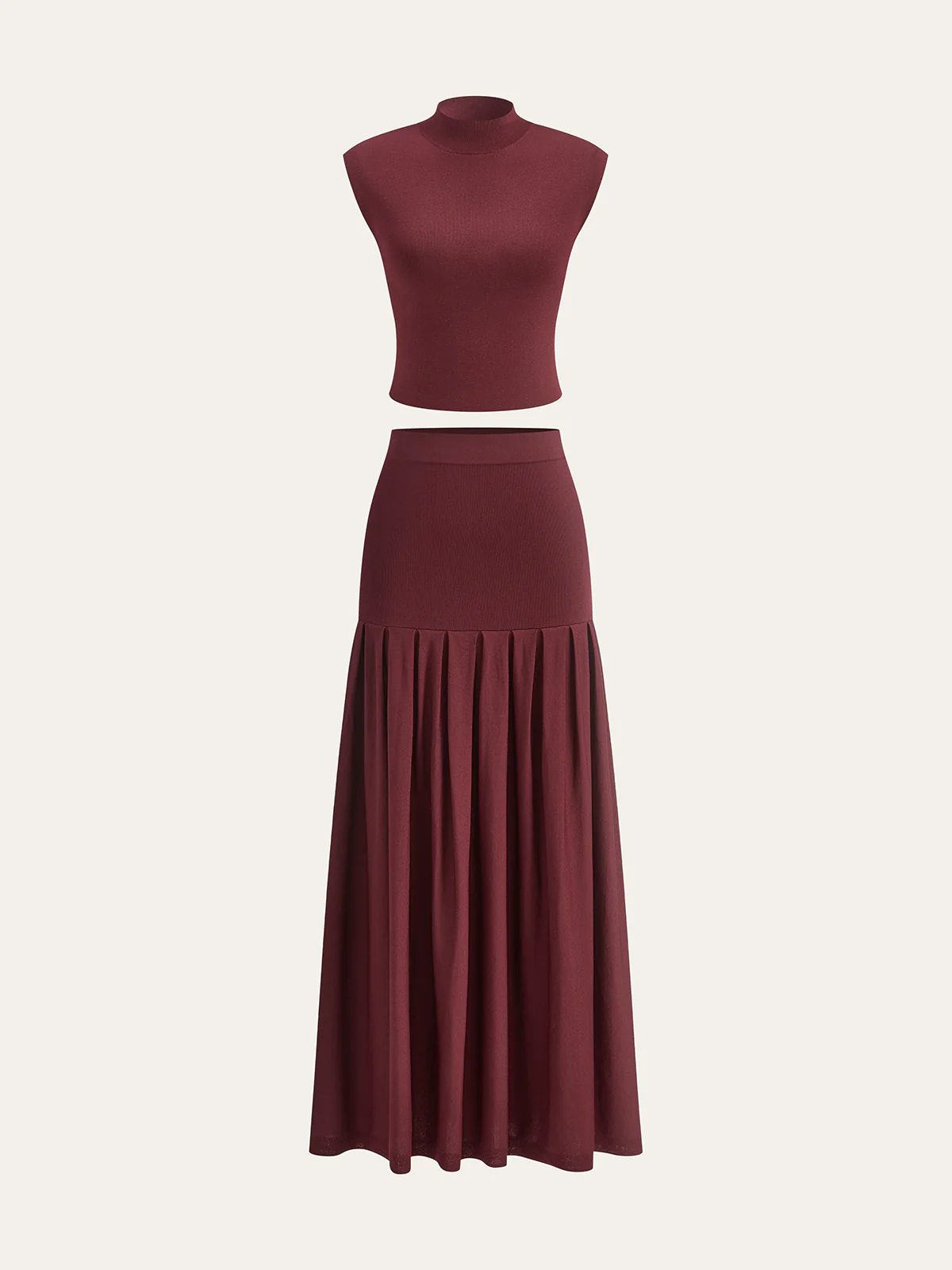 Mock Neck Sleeveless Top and Pleated Midi Skirt Set
