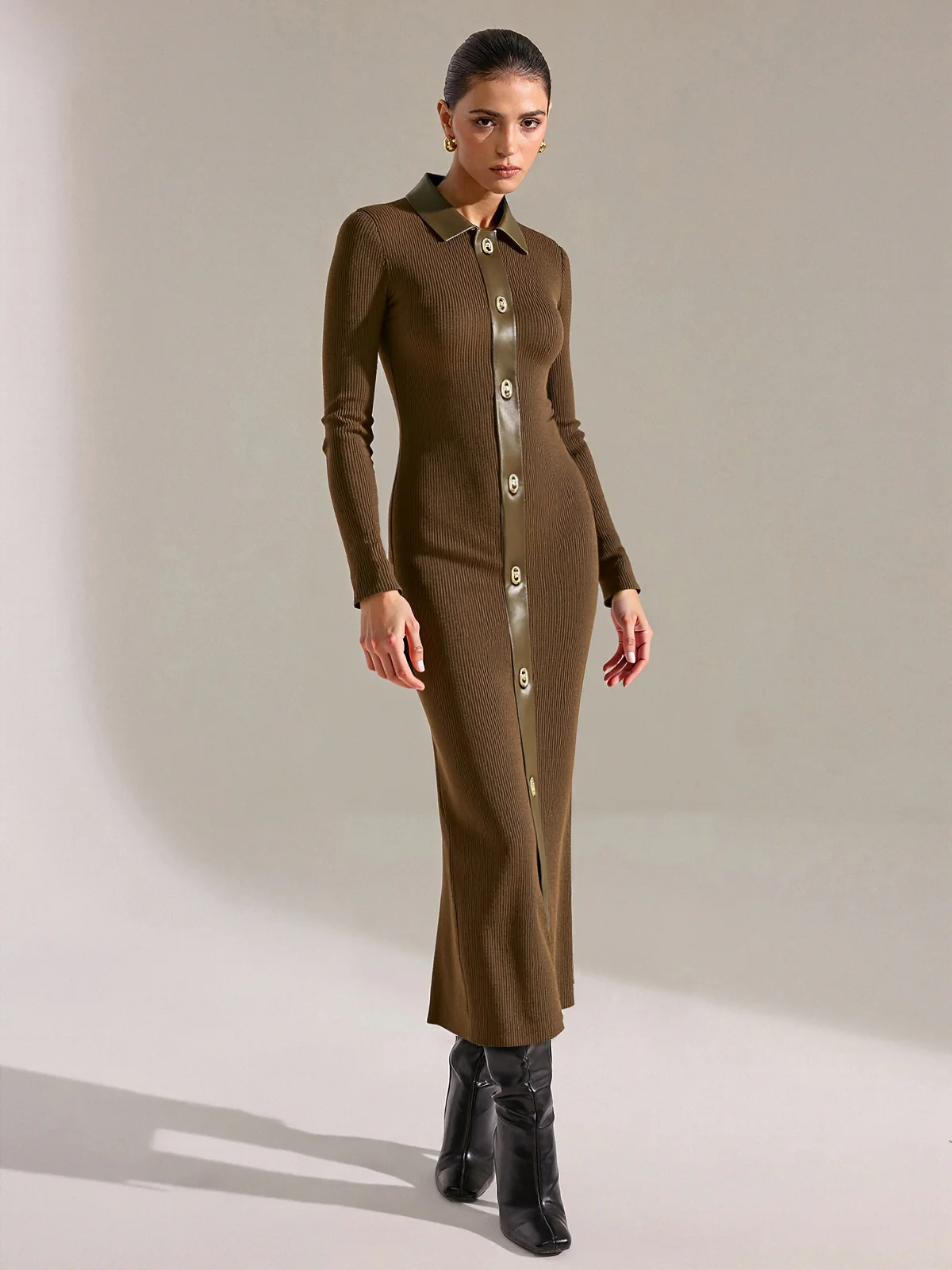 Shirt Collar Faux Leather Panel Ribbed Midi Dress
