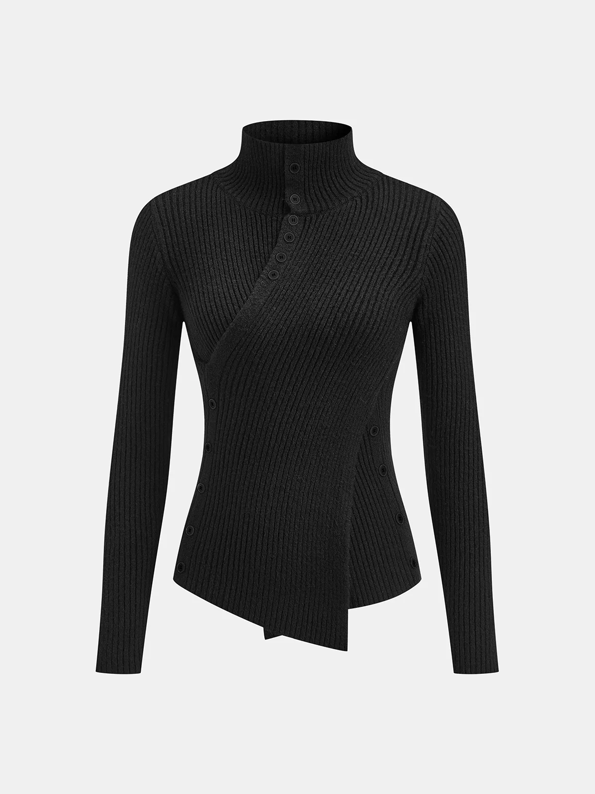 Stand Collar Asymmetric Button Ribbed Knit Top